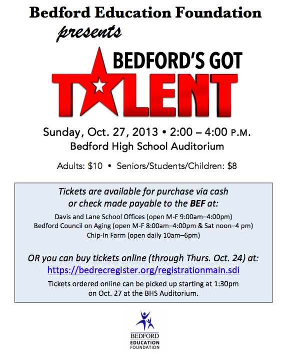 Don’t Miss Out – Buy Your Tickets Now! Posted on October 3, 2013 by mwmcallister Tickets for Bedford’s Got Talent are available for purchase at: Davis School Office Lane School Office Bedford Council on Aging Chip-In Farm OR you can buy your tickets at the door on the day of the show. Related