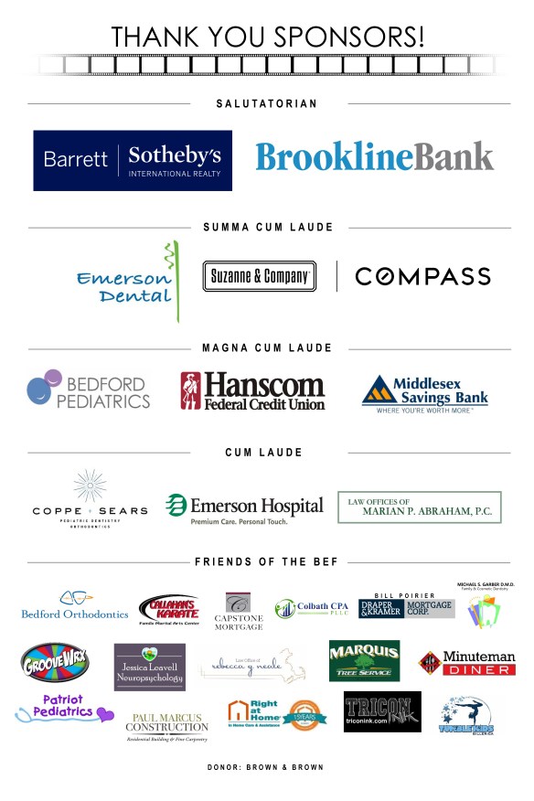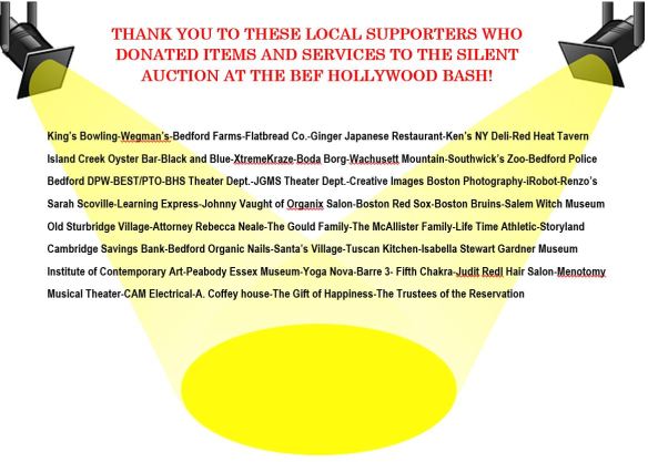 Thank you once again to our generous sponsors – please keep these local businesses in mind when you are in need of services! They have been so supportive of the BEF’s mission!Please support these local businesses and organizations when you have the chance – they helped create an amazing silent auction this year!We thank these Bedford families who opted to make a special contribution to the BEF Hollywood Bash!