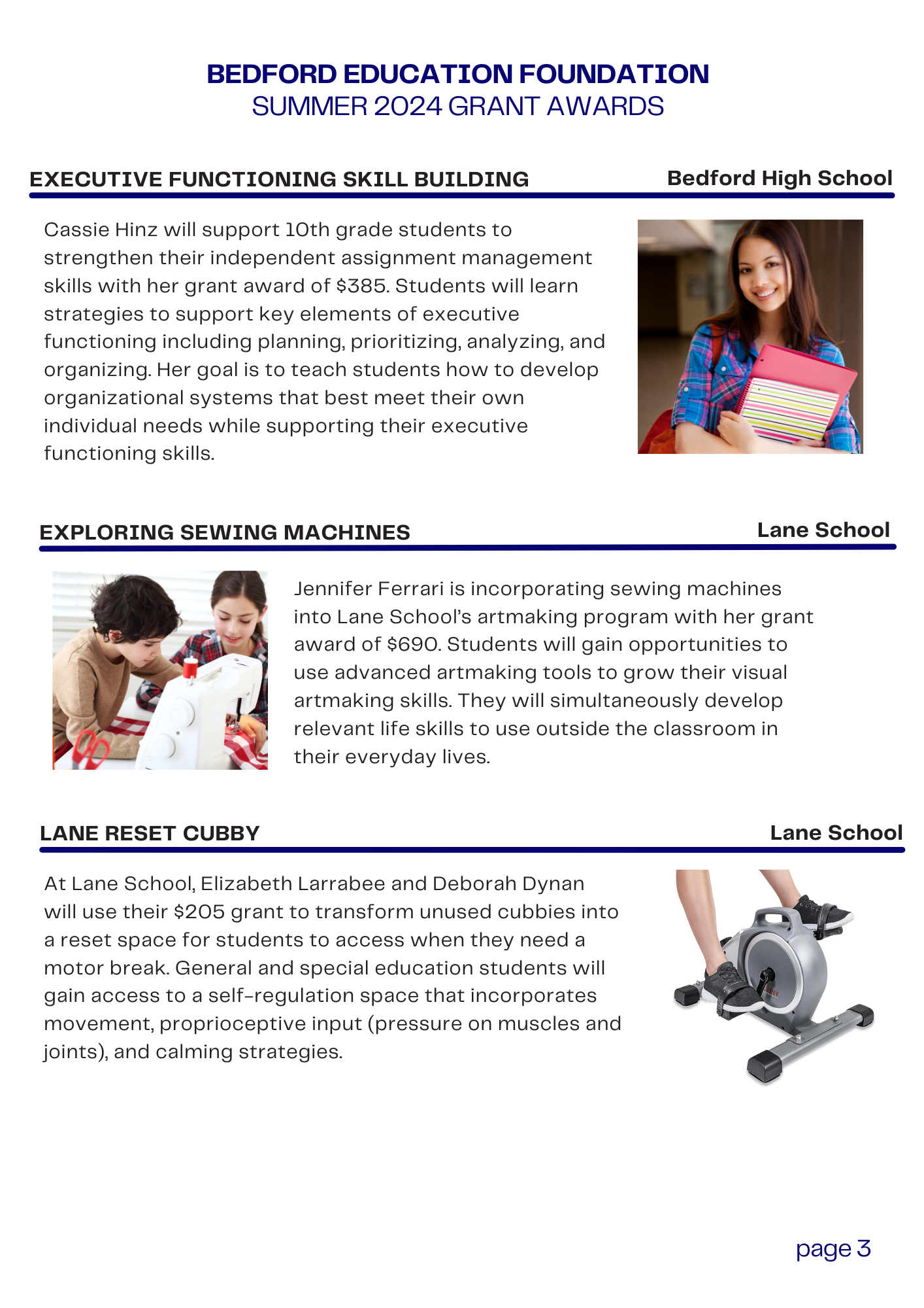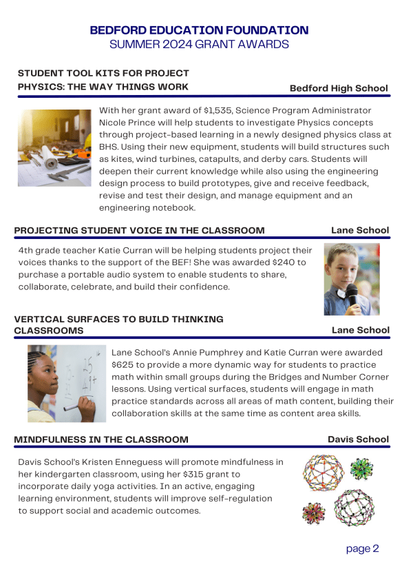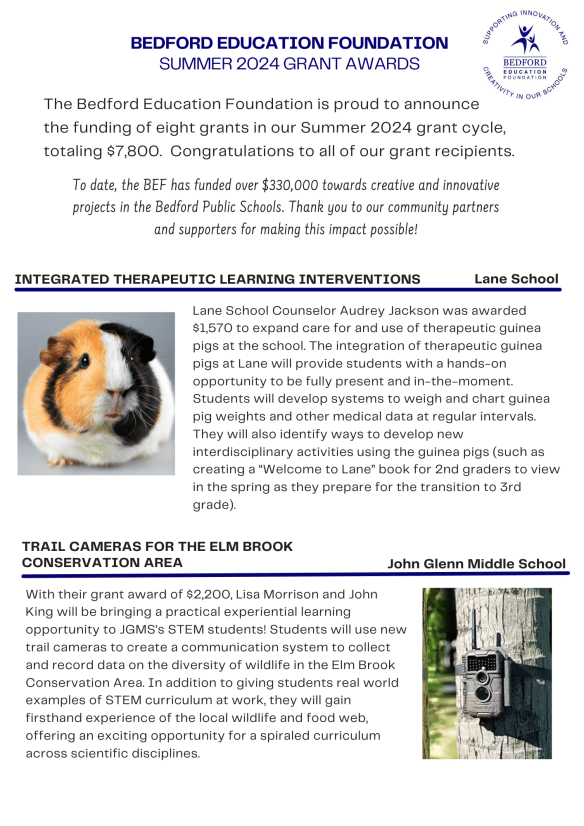 The Bedford Education Foundation is proud to announce the funding of eight grants across all four schools in our Summer 2024 grant cycle, totaling $7,800. Congratulations to all of our grant recipients!