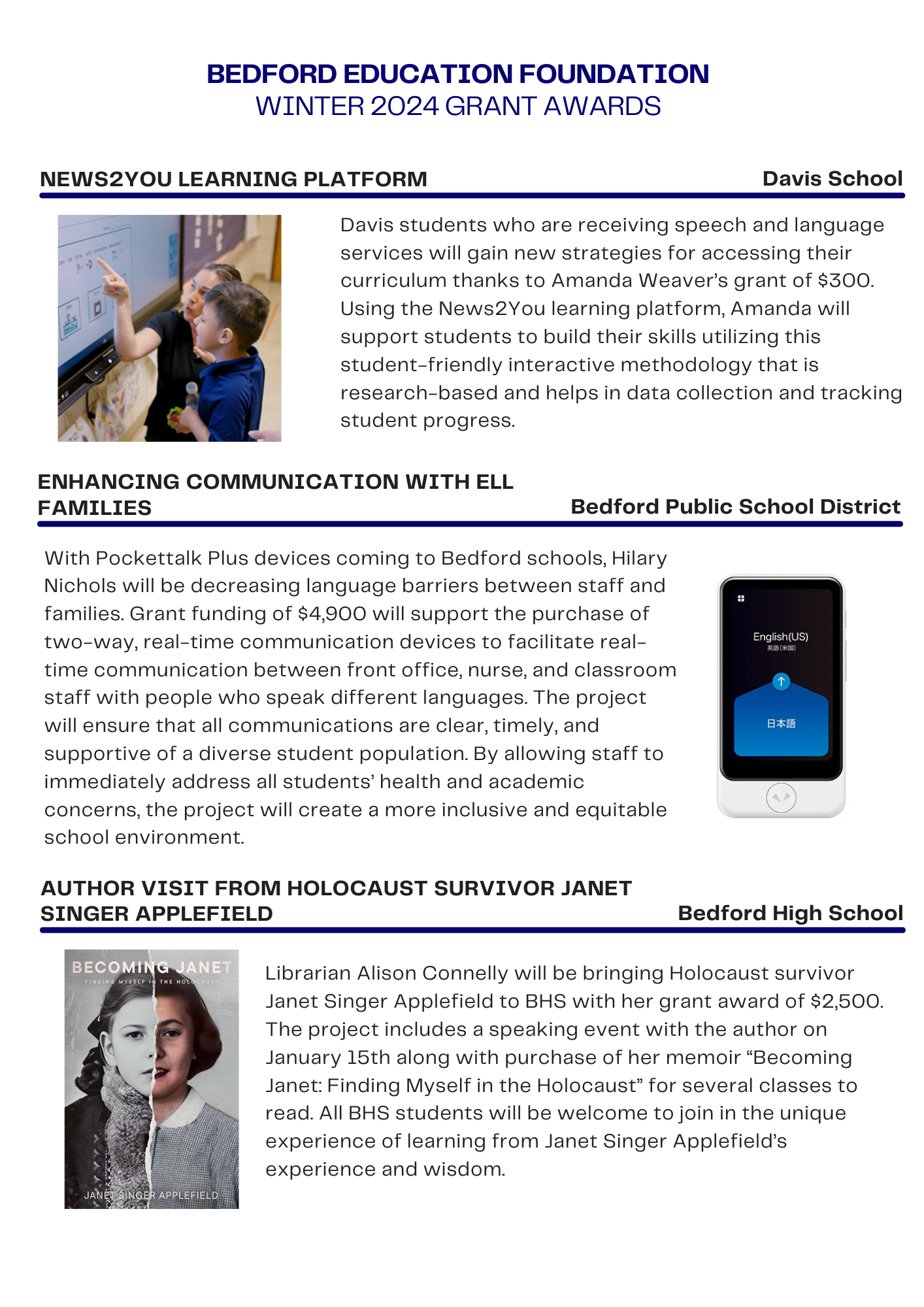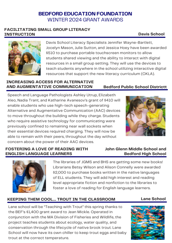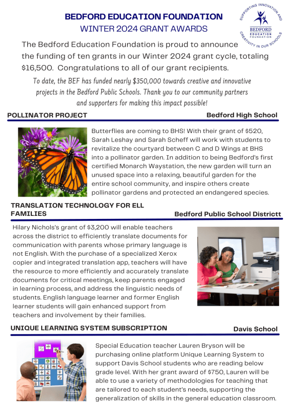 The Bedford Education Foundation is proud to announce the funding of ten grants in our Summer 2024 grant cycle, totaling $16,500. Congratulations to all of our grant recipients.