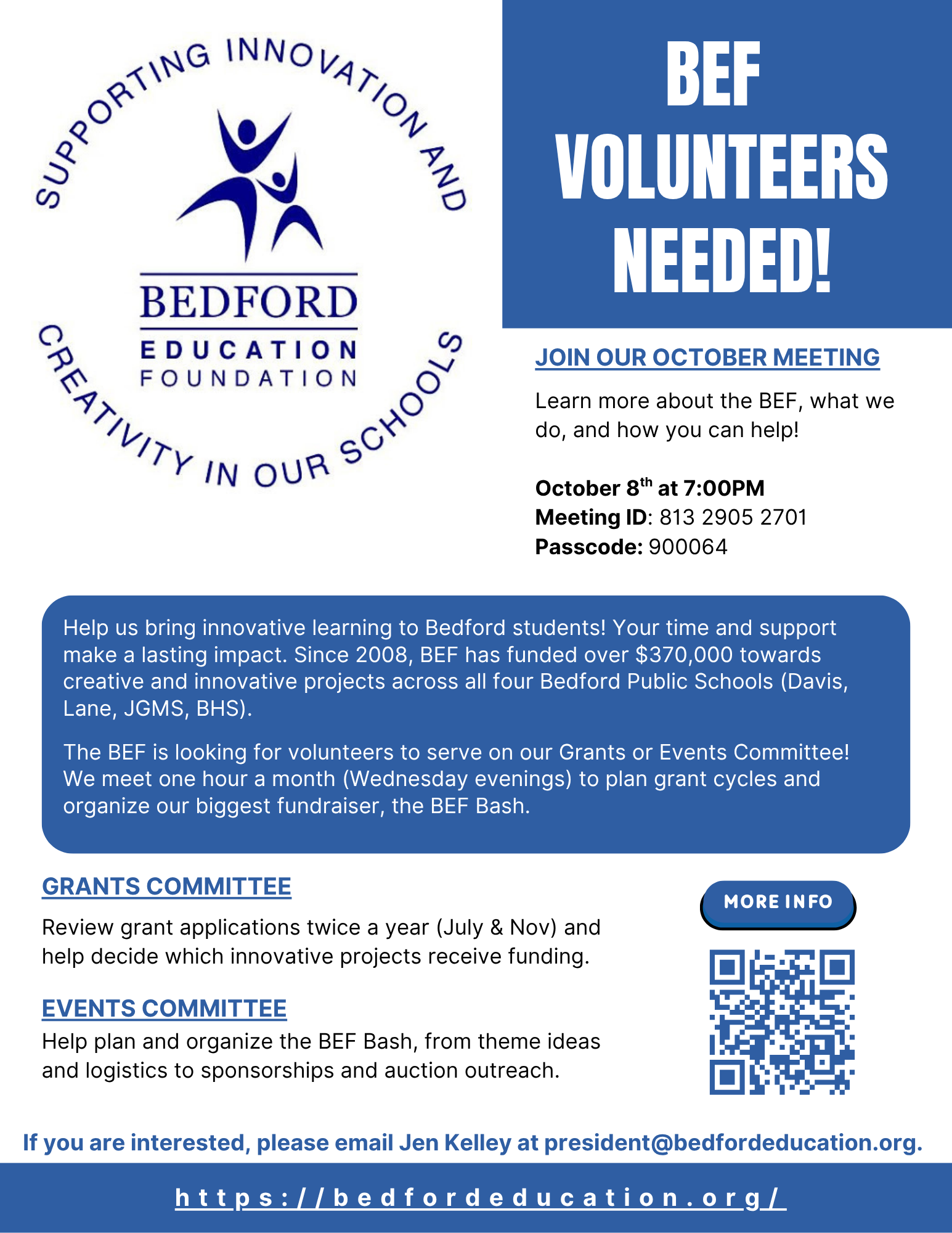 If you are interested in learning more and are unable to attend the October 8th meeting, please reach out to Jen Kelley at president@bedfordeducation.org.