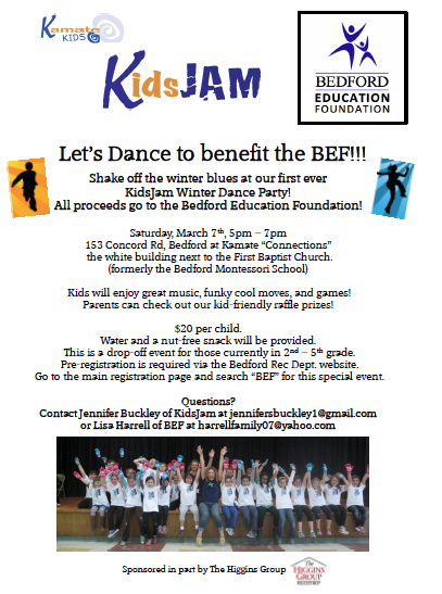 Bedford children danced away the winter blues at the first ever KidsJam Winter Dance Party on March 7 to benefit the Bedford Education Foundation (BEF). Thanks to the energetic efforts of Jennifer Buckley of KidsJam, Nancy Griffiths of Kamate Fitness, and their team of volunteers, the event was a huge success. Fifty-five children from second to fifth grade had a blast at the sold-out event as they danced, played games, and were treated to exciting demonstrations by Kamate BodyJam instructors and Callahan’s Karate Instructors. After working up a sweat, the children enjoyed a well-deserved break for a snack provided by Diane Hughes of the Higgins Group and craft time where they learned how to make three-dimensional snowflakes.